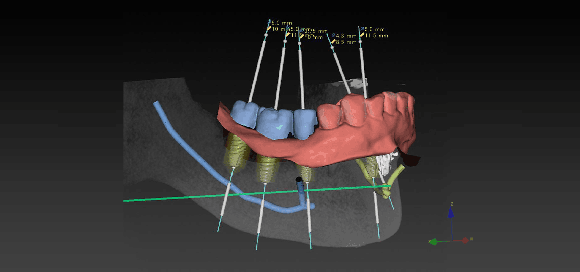 3D-CT撮影後、インプラントの埋め込み場所や⾓度がわかるノーベルガイドを作成し、歯ぐきの上からあてがえば、歯茎を切らずに安全で正確な手術が可能です。