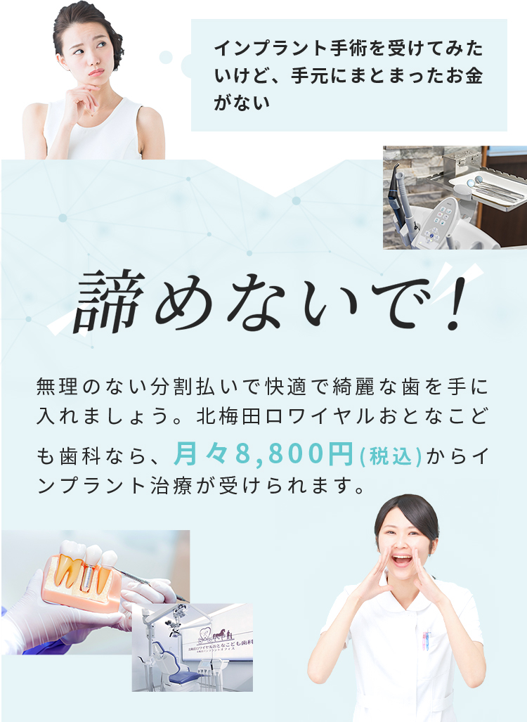 中津駅から徒歩1分の北梅田インプラントオフィスは大阪市北区、豊中市、吹田市、箕面市、京都市、奈良県など関西のたくさんの患者様にご来院いただいております。当院は、患者様を第一に考えた、安全で正確なインプラント治療を行うために、3D-CTによる正確な診断、インプラント専用のオペ室、その他高水準の医療機器を備え、All-on-4/All-on-6、ザイゴマインプラントなど最新の治療方法にも対応しております。初めてのインプラント治療はもちろん、他院で断られた方や、難症例もお気軽にご相談ください。