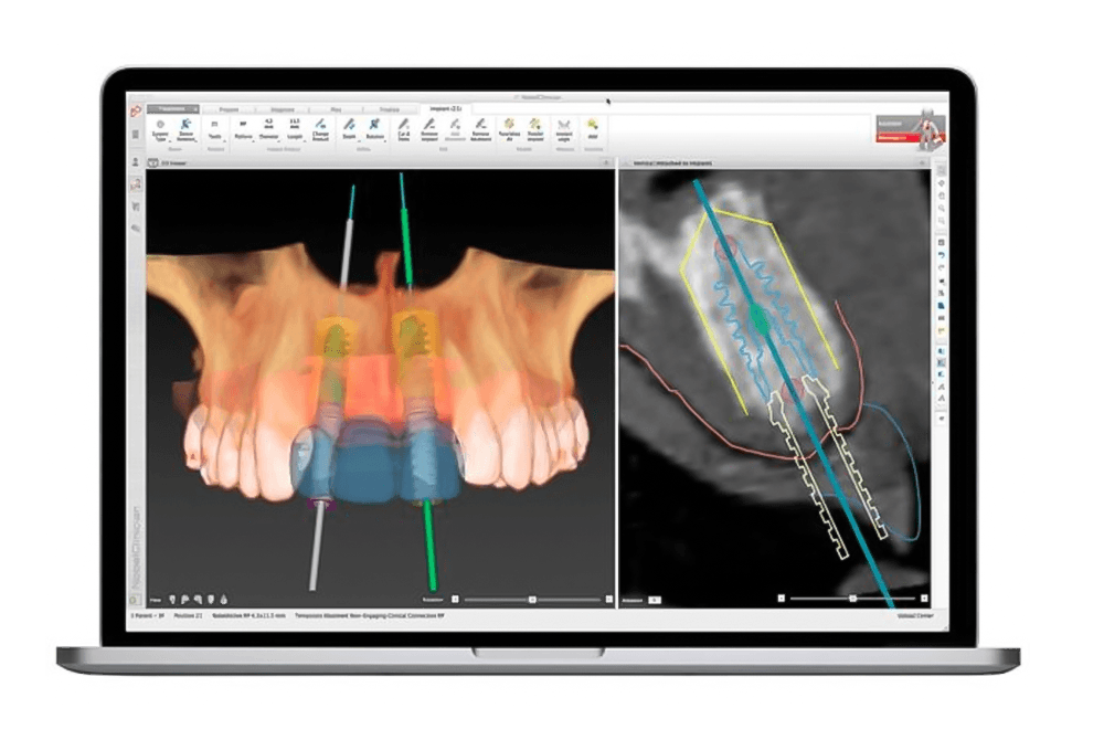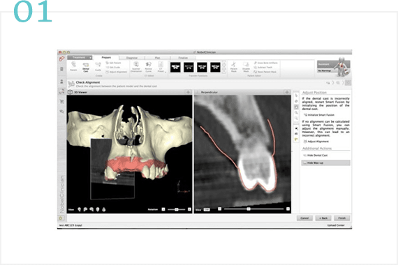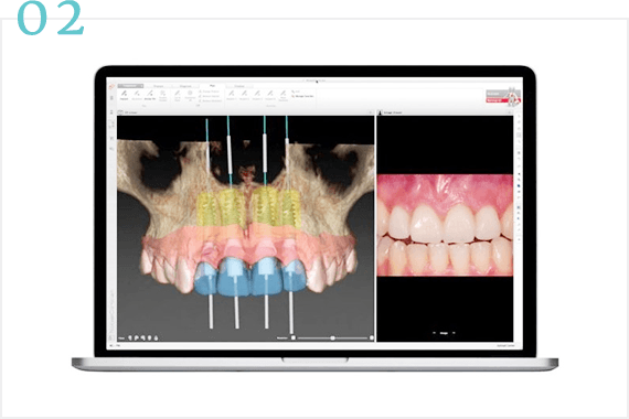 3D-CTのデータをもとに、インプラントの埋入ポイント、⾓度、深さについて、高精度なシミュレーションを行います。これにより、機能性・審美性の高い手術が可能になります。