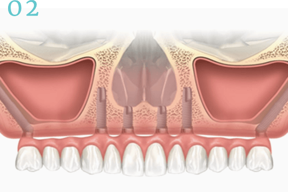 通常、前歯の骨が少ない場合インプラントは難しいのですが、このような場合、当院では頬骨にインプラントを埋入する「ザイゴマインプラント」を行っています。手術した当日に固定した歯を装着できます。