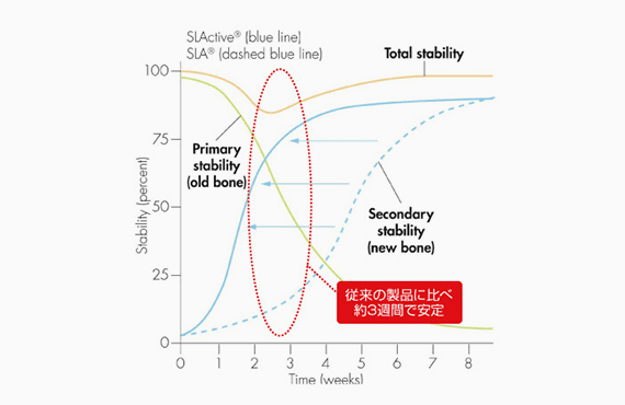 SLActive®は、治療の初期段階で高い安全性と優れた予知性をもたらすようデザインされています。オッセオインテグレーションの過程で、二つの要因が重要な役割を果たします。骨へのインプラントの初期固定(既存骨)と二次固定(新生骨)です。従来のインプラント治療に比べ、2-4週目の間に総合的な安定性が高くなるためロストリスクが低減されます。